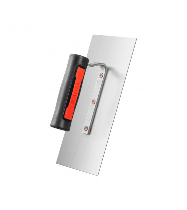 Desempenadeira de aço temperado lisa, cabo plástico com duas hastes de fixação.