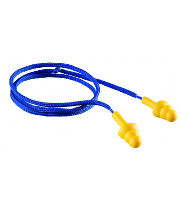 Protetor auditivo de polímero que apresenta nível de redução de ruído de 13 decibéis. Cordão em tecido e embalagem individual. Produto certificado: C.A. 10.043. Indicado para proteção auditiva.