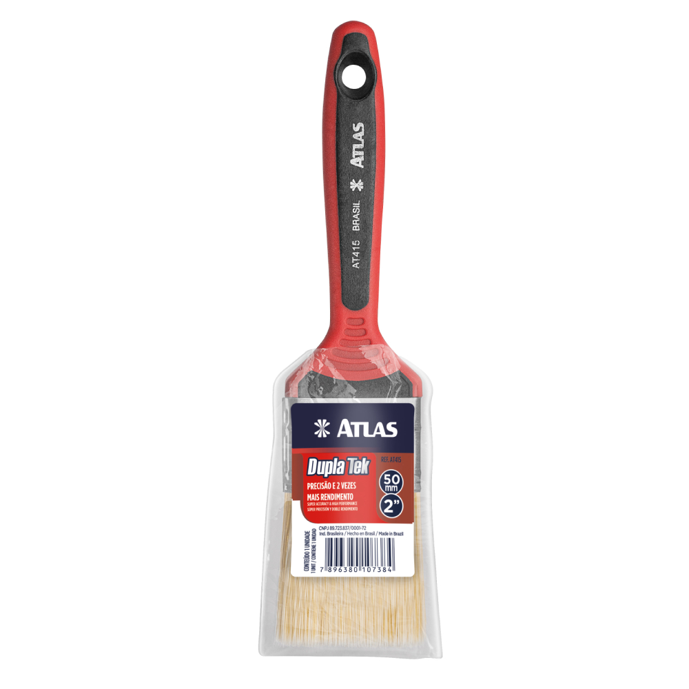Trincha Dupla de cerdas sintéticas com tecnologia Plumatek de fios formato estrelado. Melhor acabamento, maior durabilidade e recortes mais precisos para todo o tipo de tinta.