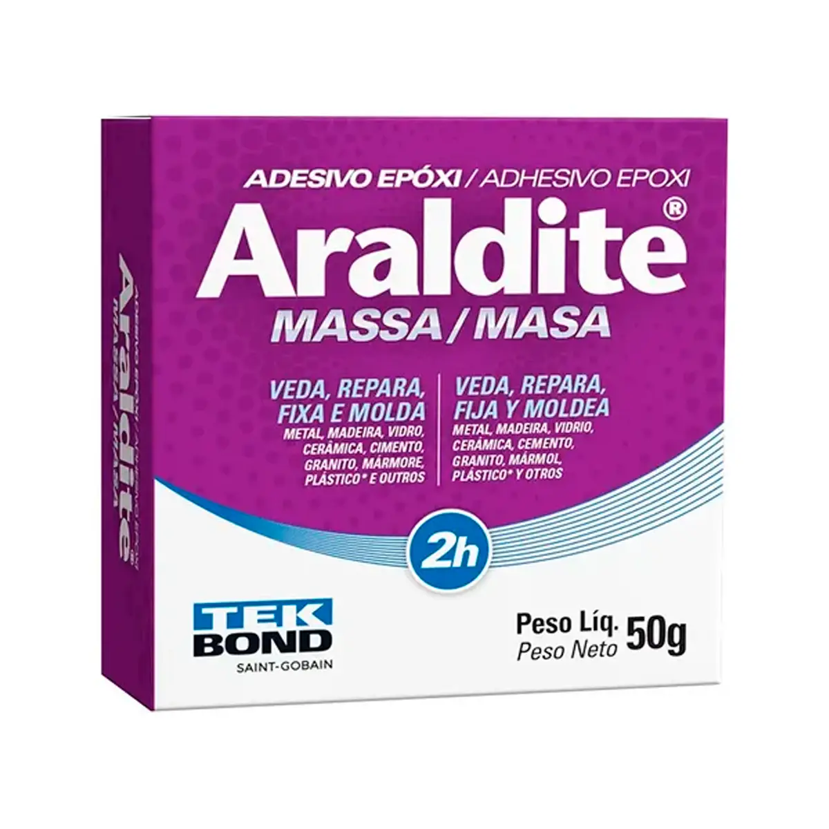 ADESIVO ARALDITE MASSA EPOXI 50G VEDA REPARA TEKBOND 10898500050 10898500050ARALDITE MASSA E UMA MASSA EPOXI BICOMPONENTE PERFEITA PARA DIVERSAS APLICACOES EM CASA, NO ARTESANATO E TAMBEM NA INDUSTRIA. SEU ALTO PODER DE ADESAO GARANTE UM RESULTADO PERFEITO PARA FIXAR, VEDAR, SOLDAR, REPARAR, MOLDAR E RECONSTRUIR COM PRATICIDADE, QUALIDADE E DURABILIDADE. PRATICA, PODE SER APLICADA EM METAL, MADEIRA, VIDRO, CERAMICA, CIMENTO, GRANITO, MARMORE E PLASTICO, POREM NAO ADERE EM POLIETILENO, POLIPROPILENO, SILICONES, NYLON E TEFLON.MODO DE USAR:1. LIMPAR AS SUPERFICIES A SEREM UNIDAS, DEIXANDO AS ISENTAS DE OLEOSIDADE, POEIRA, OXIDACOES E RESTOS DE TINTAS.2. MISTURAR A MESMA QUANTIDADE DO COMPONENTE A (RESINA) E DO COMPONENTE B (ENDURECEDOR) ATE OBTER UMA MASSA CINZA HOMOGENEA.3. APLICAR A MASSA E MODELAR ATE OBTER O FORMATO DESEJADO.4. AGUARDAR A SECAGEM COMPLETA.DICA: PARA MELHOR ACABAMENTO UMEDECA AS FERRAMENTAS OU OS DEDOS.OBSERVACAO: EM TEMPERATURA ABAIXO DE 25 C, O TEMPO DE SECAGEM E SUPERIOR A 2 HORAS.E PRECISO ESPERAR 12 HORAS PARA ACABAMENTOS COMO: APLICACAO DE TINTA, VERNIZ, SERRA OU LIXA.COMPOSICAO:COMPONENTE A (RESINA): RESINA EPOXI. COMPONENTE B (ENDURECEDOR): AMINA ALFATICA, POLIAMIDOAMINA.CURA INICIAL: 2 HORASCURA TOTAL: 24 HORAS.