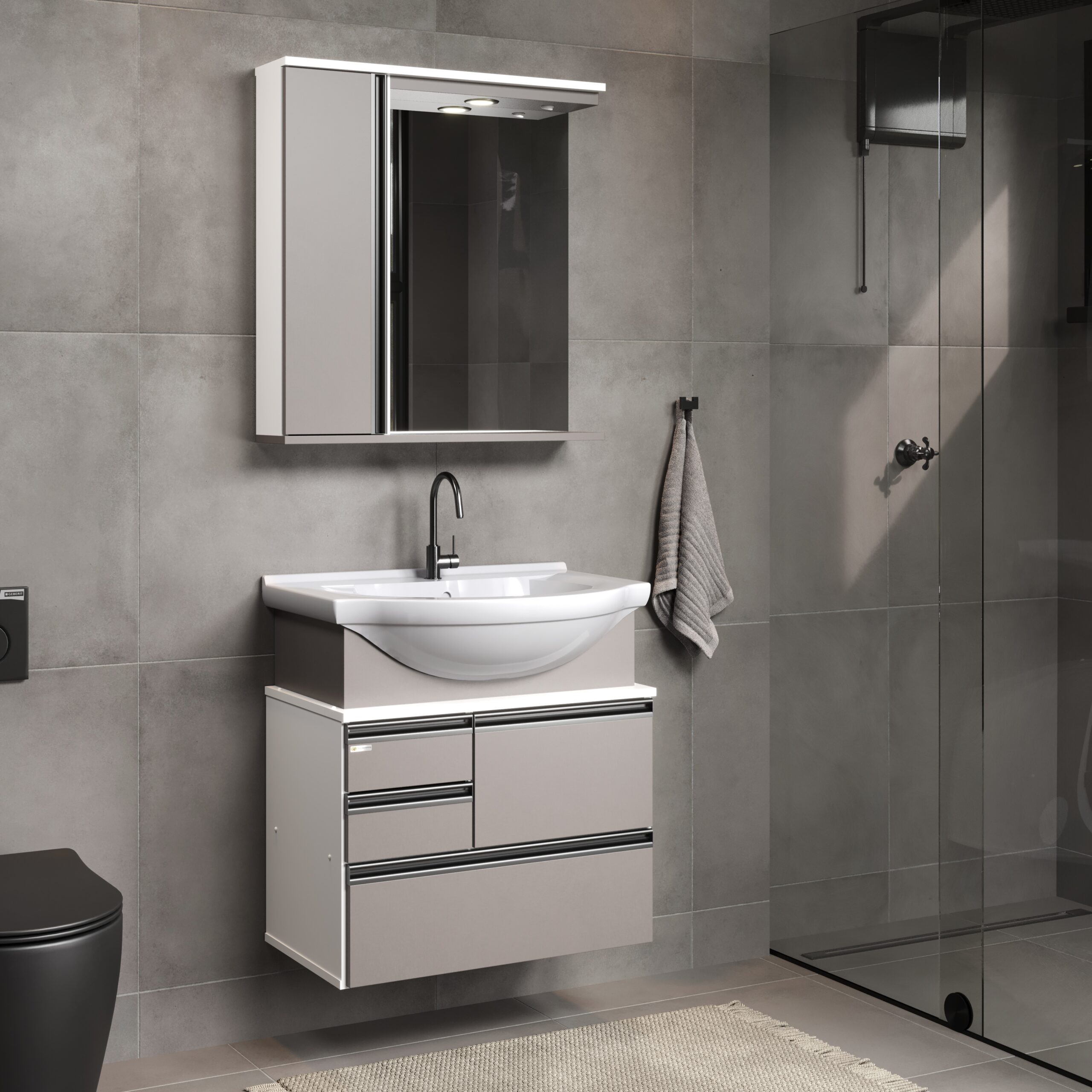 Linha Firenze é inovadora e moderna. Possui estrutura do gabinete, frentes de gavetas, portas e frontão em MDP BP – 15mm madeirado com lâmina melamínico, proporcionando maior resistência à umidade e fácil limpeza, produto de alta qualidade, e durabilidade incomparável. Os puxadores em perfil de alumínio, corrediças e dobradiças em metal reforçado que proporcionam a abertura suave e completa das portas e gavetas, mostram mais um diferencial e praticidade deste produto. Possui pia própria em louça com designer robusto e moderno, onde acompanha válvula do tipo click-up.