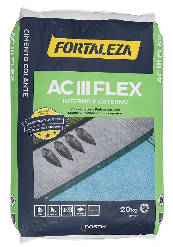 A Argamassa AC III Flex Fortaleza é ideal para assentamento de porcelanatos, pedras naturais e cerâmicas em áreas internas e externas, com alta resistência à umidade e variações térmicas. Seu uso é indicado para fachadas, piscinas, saunas e churrasqueiras.