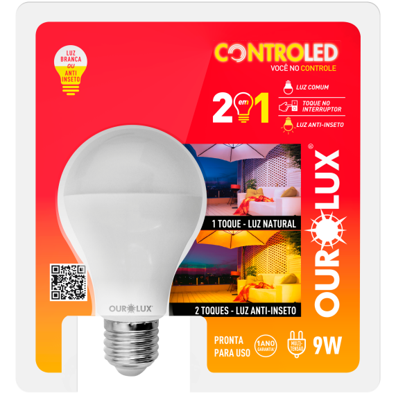 Lâmpada com duas funções, luz branca e anti-inseto. Ao ligar a lâmpada uma primeira vez a luz será branca (6500K), ao desligar e ligá-la uma segunda vez, ela entrará em sua função anti-inseto, tendo sua luz na temperatura de cor de 1900K, com uma característica diferenciada na emissão de luz, que não atrai os insetos.