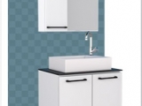 O banheiro em aço Pêssego da Cozimax possui espelheira com armarinho, cuba sobreposta, toucador com portas e puxadores em alumínio e tampo de vidro temperado que protege o toucador de respingos, ideal para quem está em busca de qualidade e garantia para o seu banheiro.