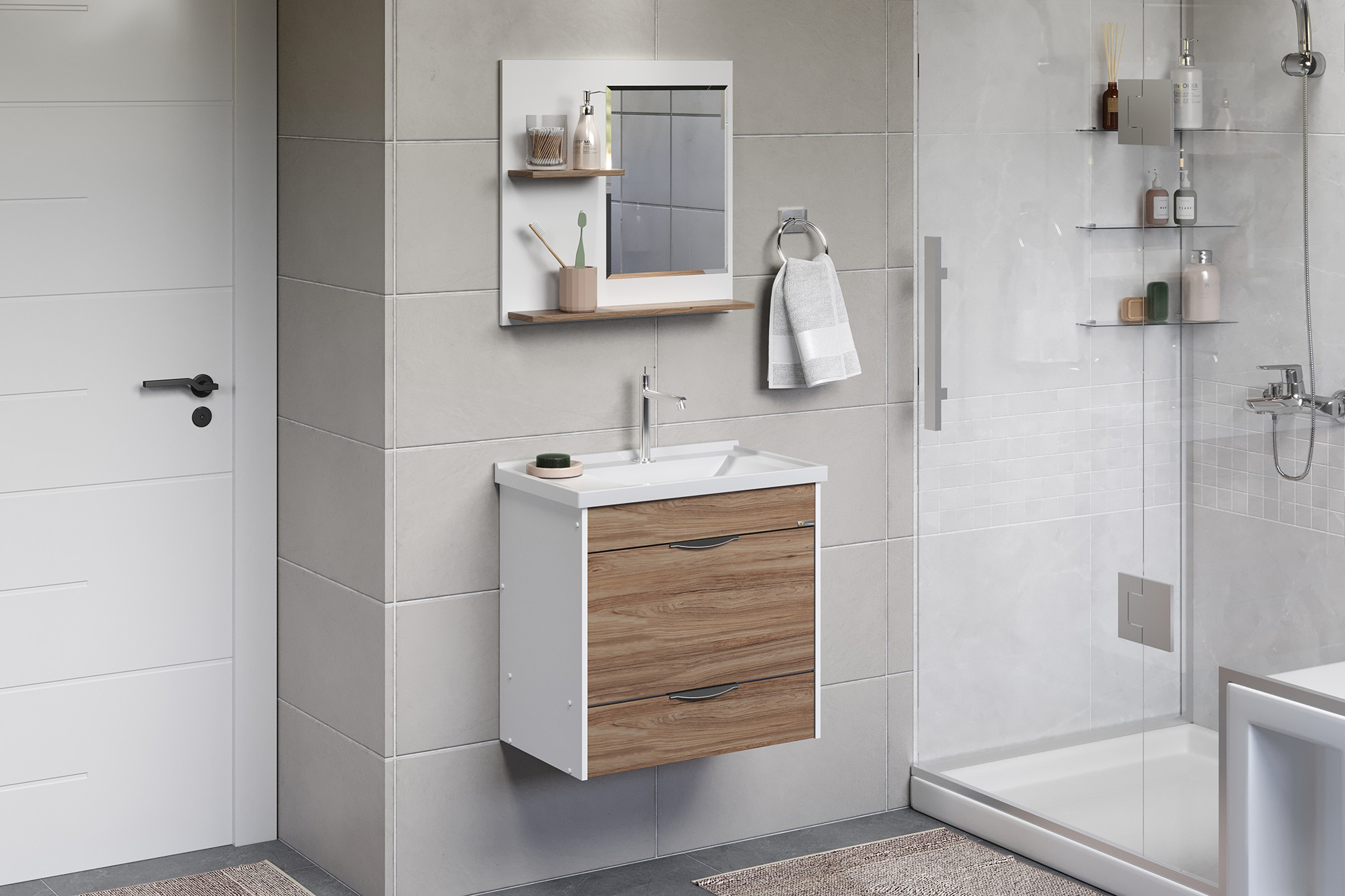 Possui uma composição integrada entre os padrões texturizados e madeirados, e espelheiro que completam esse conjunto, tornando-o sofisticado e aconchegante, sem deixar de lado a praticidade e facilidade de montagem, que é característica dos produtos A. J. Rorato.