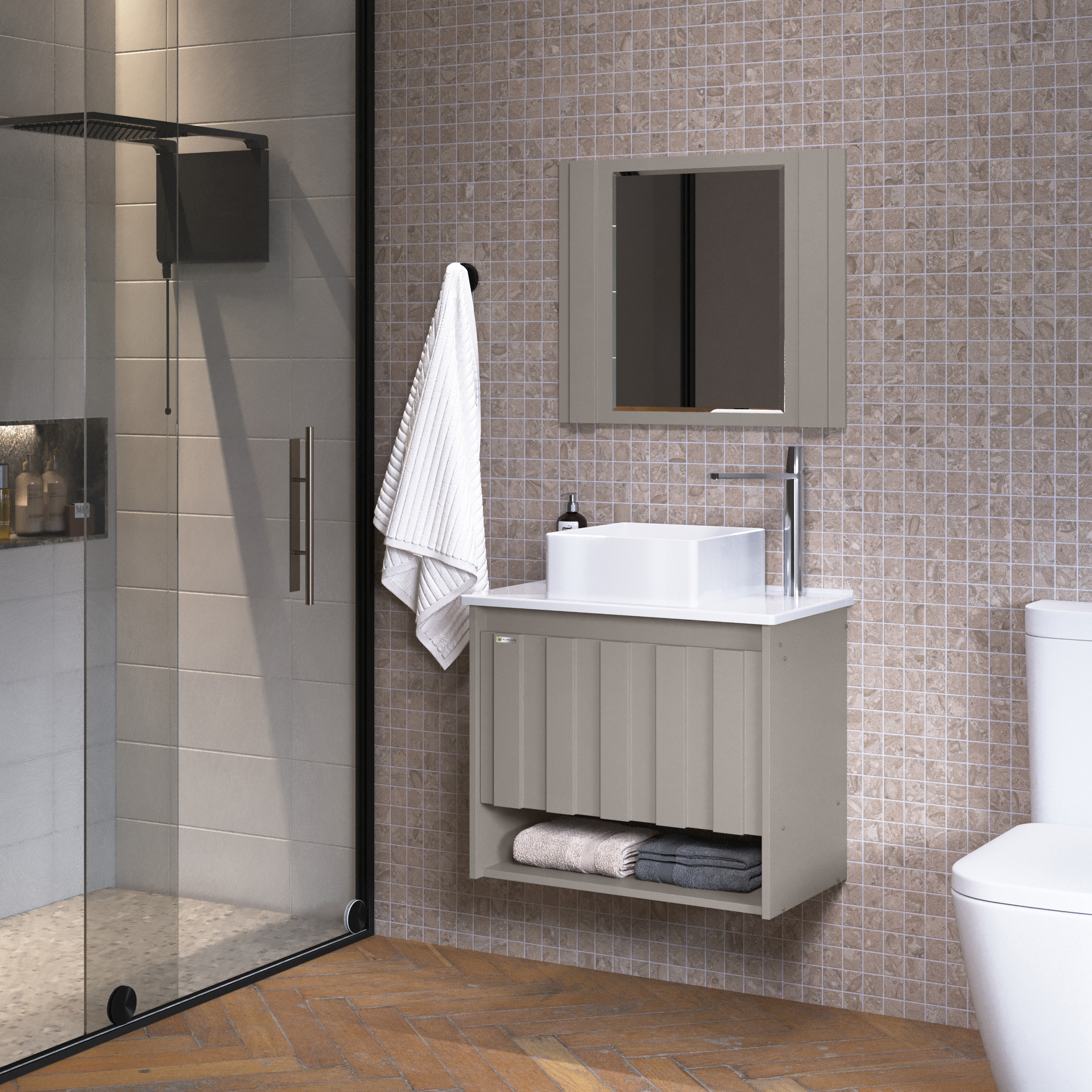 O armário kit Treviso possui composição harmoniosa entre espelheiro e armário, com design estilo ripado que o deixa mais moderno e bonito além de prático, com sua gaveta interna que facilita na organização dos objetos, nicho inferior com ótimo espaço interno e porta de bascular com pistão a gás para uma abertura suave. Sua estrutura é 100% em MDP – BP amadeirado ou texturizado, e possui várias opções de tampo e cuba de sobrepor    se adequando a todos os tipos de ambientes, e ao gosto do cliente.