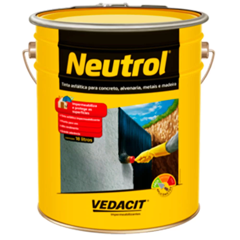 NEUTROL é uma tinta asfáltica de grande aderência e alta resistência química que forma uma película impermeável. É indicado para proteção de estruturas de concreto e alvenaria revestida com argamassa em contato com o solo sujeita a águas e aos meios agressivos. Indicado também para estruturas de madeira e metálicas não expostas a intempéries. Após a secagem, NEUTROL não deixa cheiro nem gosto na água e nos alimentos.