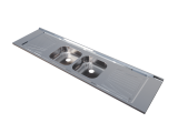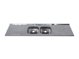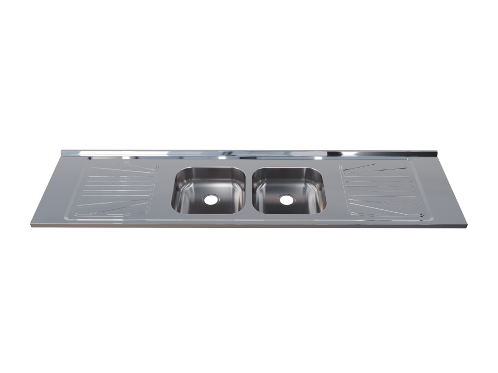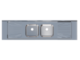 Pia de cozinha em aço inoxidável com 200cm de comprimento, com cuba dupla central.