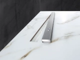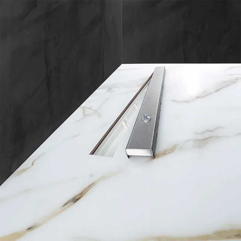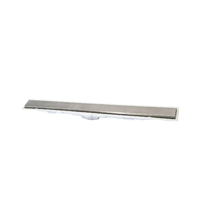 - Ralo linear com acabamento em inox, design moderno e minimalista, ideal para áreas internas e externas, com alta vazão e fácil limpeza;